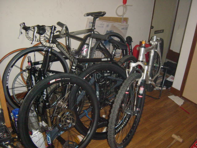 なぜか何台も自転車があり、バラして必死に小さくしています。